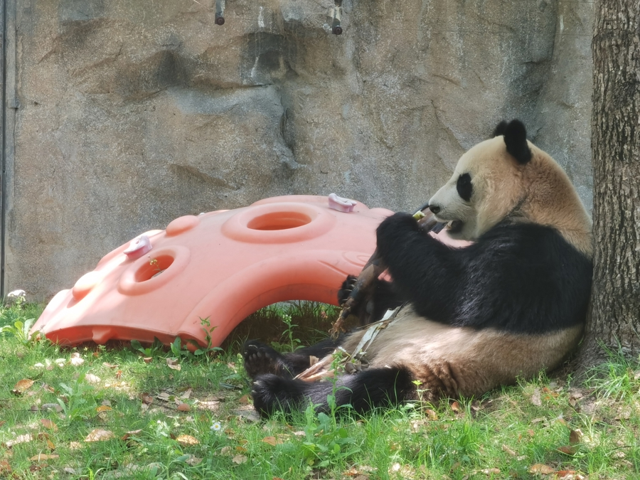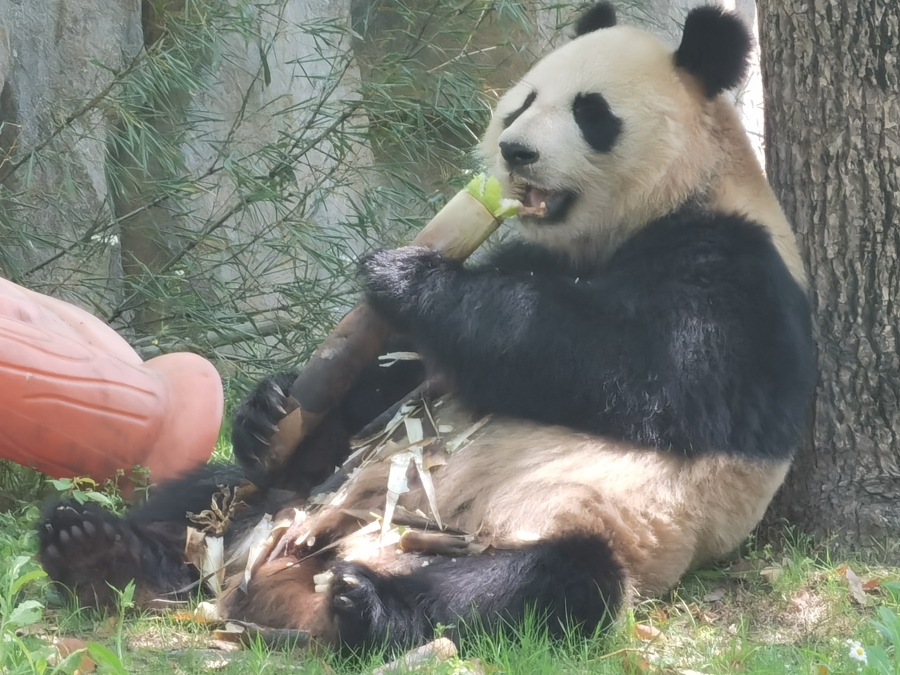 解放日报·上观新闻记者今天上午在全面升级后的熊猫展区看到,“芊真”背靠大树坐着,美美地啃着大竹笋,由于太沉浸,很晚才发现肚子上已经叠了一层笋皮,这才用手轻轻拨走,然后继续吃。