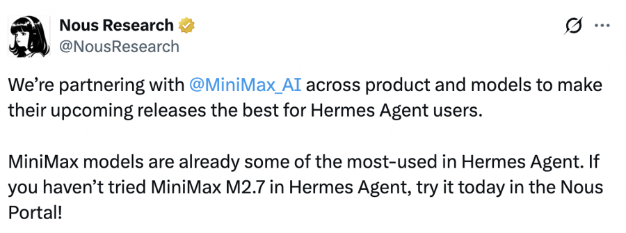 Hermes开发团队点赞MiniMax。