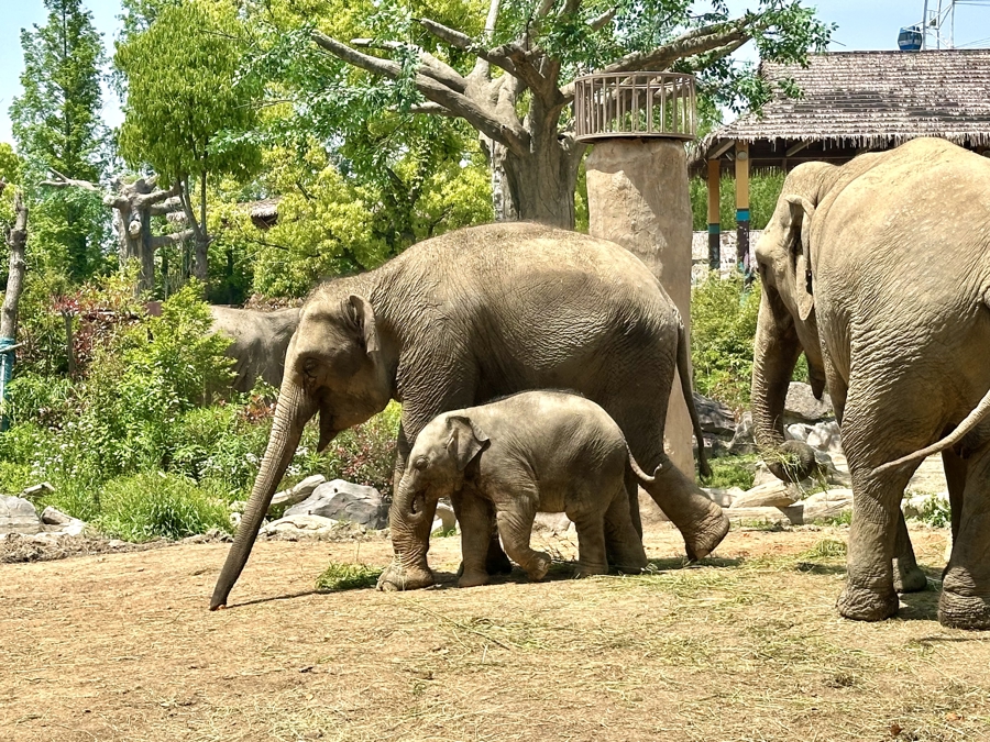 大象展区也迎来了“新人”。新民晚报记者看到,亚洲象“格兰”的新生宝宝“格兰崽”正寸步不离地跟着姐姐“小美”在场区里觅食、散步,妈妈“格兰”则在旁保护。